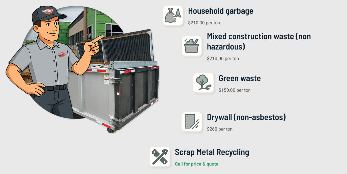Onestop Bin Rental will dispose of most non-hazardous materials such as construction debris, demolition or renovation debris, yard trimmings, green waste, household junk, appliances, furniture, scrap metal, dirt, sod, rocks, gravel, cement, concrete, bricks, asphalt, drywall, roofing, and garbage.