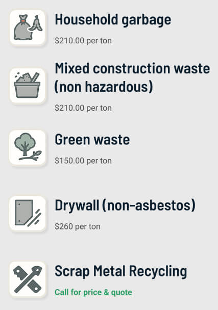 The pricing for our dumpster bin rental services is dependant upon the type of materials, and the volume and weight of material as determined by the appropriate transferstation. Please contact us for DETAILED, CLEAR & STRAIGHTFORWARD rates.